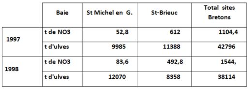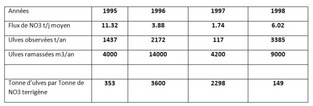 Tableau 2 tonnages d’azote nitrique au printemps et prolifération d’ulves en baie de Douarnenez (d’après Merceron et al. 1999 Ifremer)